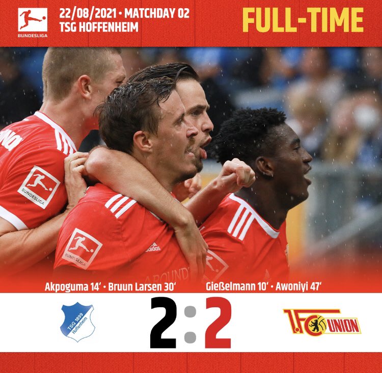 Anpfiff war um 1530 Uhr. FC Union Berlin live score and video online live stream starts on 22 Aug 2021 at 1330 UTC time at PreZero Arena stadium Sinsheim city Germany in Bundesliga Germany. Nach ihren jüngsten 40-Siegen Hoffenheim in Augsburg Union bei Kuopio gingen die Teams mit einer großen Portion Selbstvertrauen ins Spiel - und das merkte man.